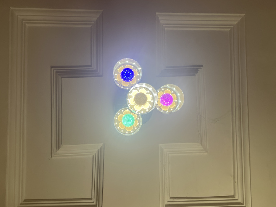 An overhead photograph depicts a five-unit LED ceiling light fixture against a white, paneled ceiling in Sabon Tasha, Nigeria. The ceiling features pronounced recessed rectangular molding. The light fixture comprises five circular modules arranged in a cluster. Each module displays an outer ring of small white LEDs. The central illumination of these modules consists of distinct colors: one module glows teal-green, one glows blue, one glows magenta-pink, and two modules emit a sparkling gold-yellow light. No individuals, actions, or additional objects are present in the visible area.