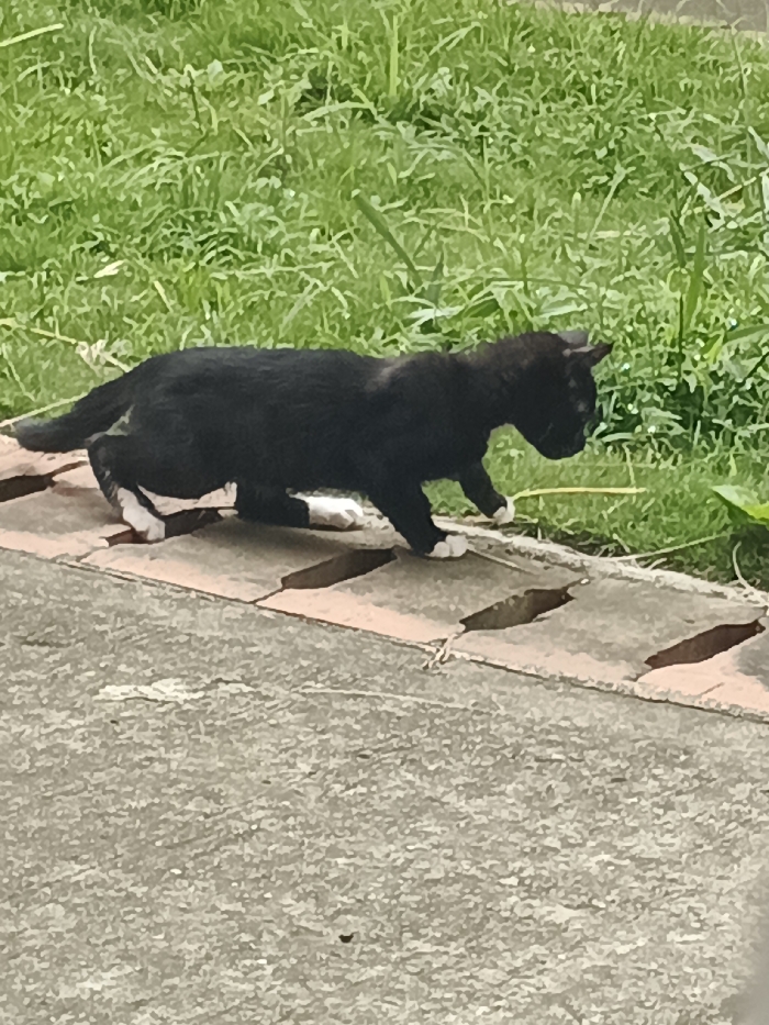 - "A black cat with white paws walks along a cracked brick edge bordering a concrete surface and grassy area" by FM-n8S452, licensed under CC BY 4.0