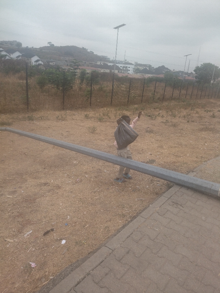 young boy standing on a paved sidewalk in Aso, Nigeria. He is wearing a pink shirt and khaki pants and holding a large black plastic bag. He is looking up to the left of the frame, as if he is waiting for someone or something. He is standing on a sidewalk, which is bordered by a curb and a dirt patch. There is a broken streetlight pole lying on the ground. The pole is silver and is lying across the sidewalk, blocking the path. There are several houses in the background of the image. The houses are all painted white and have red tile roofs. They are behind a chain-link fence. There is a large hill behind the fence. The image is taken on a cloudy day. The sky is a light grey and the sun is not visible. There is a chain-link fence behind the boy and the houses. The fence is overgrown with weeds and shrubs. The ground is covered in dirt and dried grass. The image shows the boy in a moment of vulnerability and waiting. He is standing alone in a rural area. The broken streetlight pole is a symbol of neglect and poverty. The houses in the background are a sign of hope and prosperity. The chain-link fence and weeds are a reminder of the challenges faced by the community. The image is a visual representation of the contrast between poverty and prosperity.
