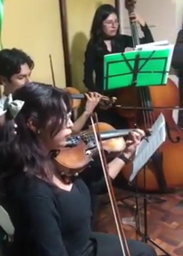 small musical ensemble of three people playing violin and double bass. They are reading sheet music and appear to be rehearsing or performing. As the camera pans, a small group of men in green and yellow vests stand to the right of the musicians. They seem to be watching the performance. The scene takes place indoors, with pictures on the wall and some decorations in the background. The atmosphere seems to be informal and festive.