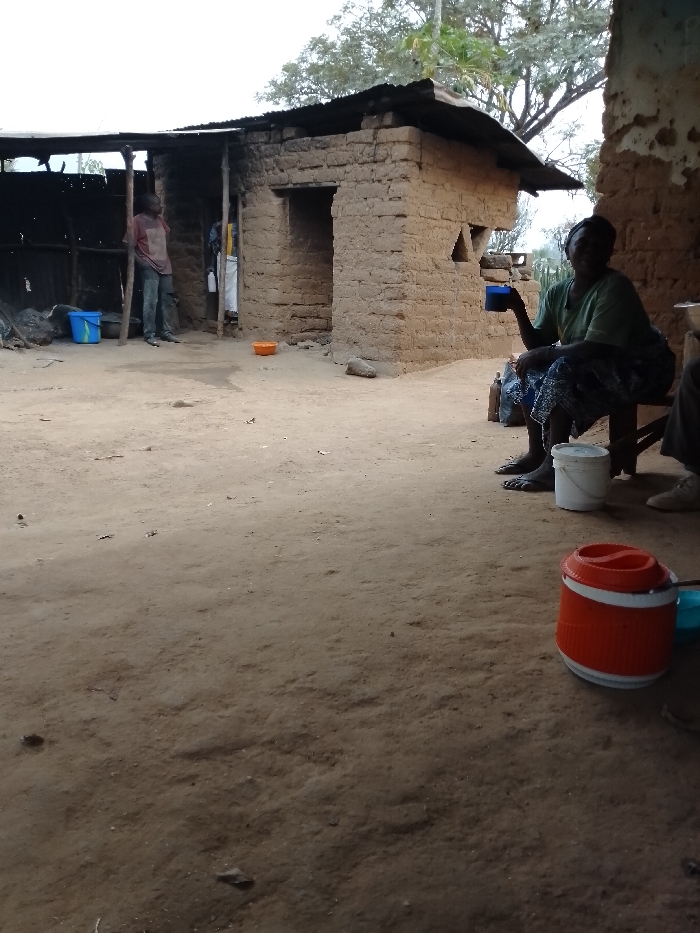 A rural scene features a mud brick house with a makeshift tin roof. A man stands near a blue bucket by the house's open side, while an older woman sits on a wooden stool, holding a blue cup, near the corner of the house. An orange and white water cooler sits on the ground in the foreground. The ground is bare earth. A few trees are visible in the background.