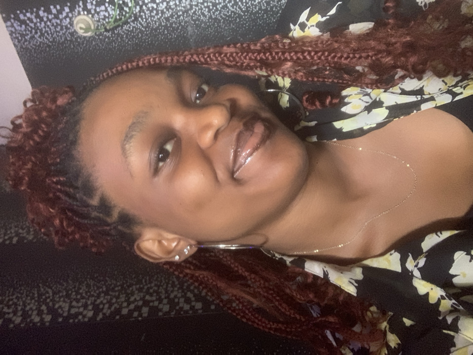 A woman with brown skin smiles, wearing red-toned braids