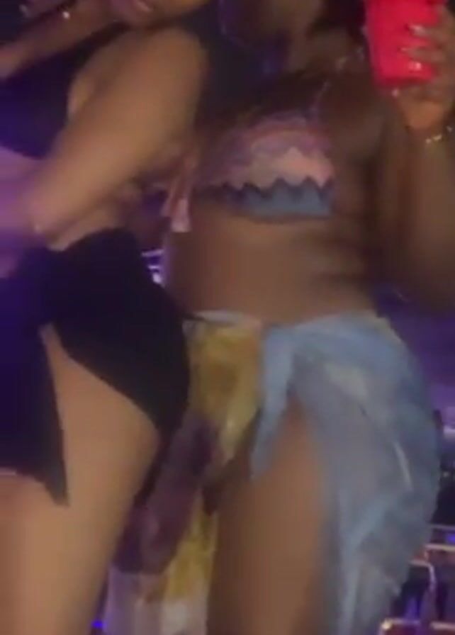 Two women dance close to each other. The woman on the left wears a black bikini top and a black sarong. The woman on the right wears a colorful bikini top and a light blue sarong and holds a red cup. The scene appears to be a party, with other people and tables visible in the background.