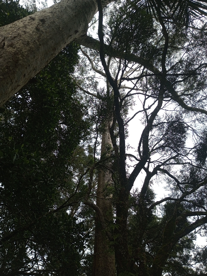 A view looking up into a forest canopy. A massive, smooth-barked tree trunk dominates the left side, contrasting with the intricate network of dark branches and foliage to the right. A tall, slender tree trunk ascends towards the center, flanked by dense green leaves. Bare branches reach towards the overcast sky, creating a silhouetted, textured pattern against the pale background. The composition emphasizes height and the complexity of the natural environment.