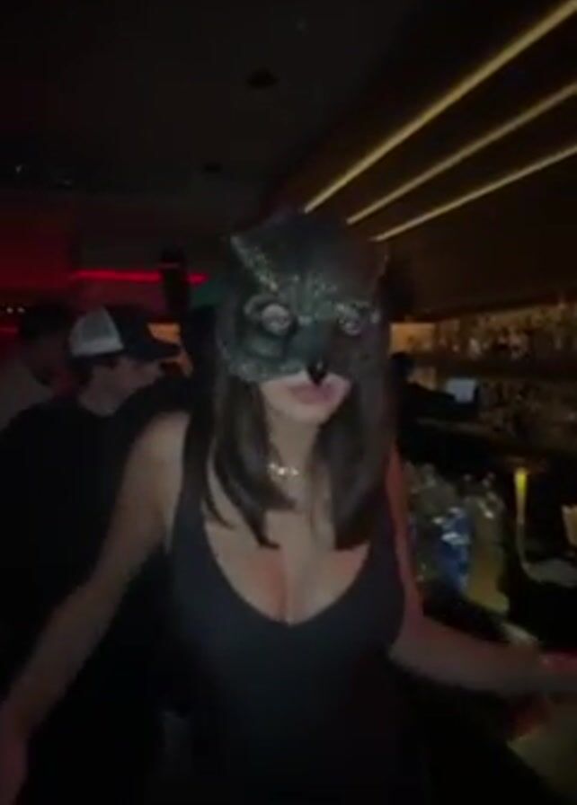 A woman wearing a dark-colored bodysuit and brown pants, poses while wearing an owl mask inside a dimly lit bar. The bar has a wooden ceiling with strips of light and a fully stocked bar. There are other people in the background, including one wearing a white baseball cap. The woman dances slightly with her hands up near her face while looking at the camera.