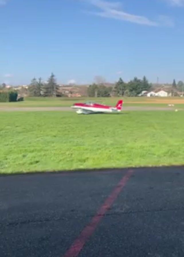 small red and white plane sitting on a grass field adjacent to a cracked tarmac. The sky above is blue with scattered clouds. In the background, there are trees, houses, and fields. The plane appears stationary in the middle of the frame. The camera's perspective is from the edge of the tarmac looking across the grass towards the plane.