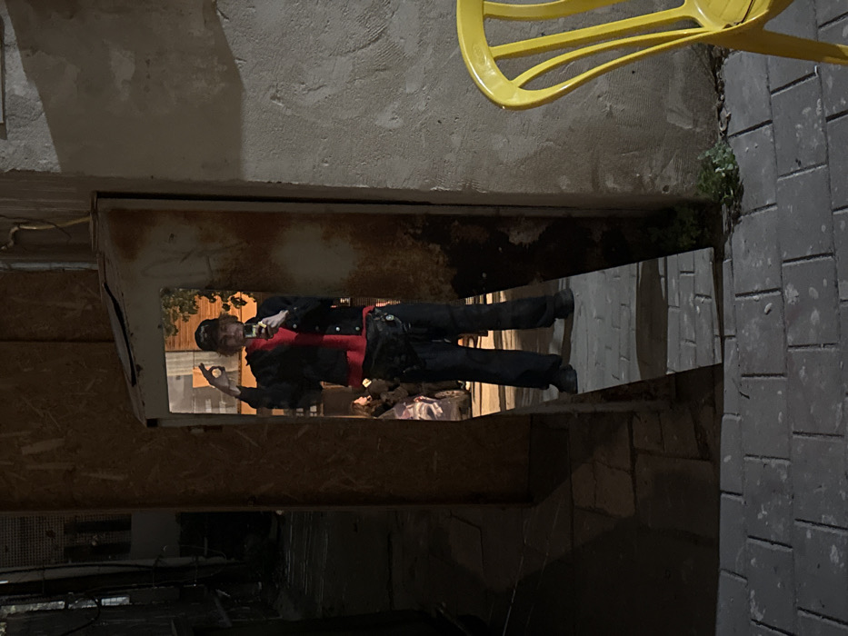 The image displays a nighttime urban scene in what appears to be an alleyway or narrow side street in Tel-Aviv, Israel, characterized by older, somewhat dilapidated building facades. The central subject is a tall, narrow mirror, approximately 1.8 to 2 meters in height, leaning upright against a doorway or recess on the right side of the frame. The mirror's frame is metallic, appearing rusty and worn. The mirror itself reflects a male individual, visible from head to toe, holding a black smartphone in his left hand, pointed towards the mirror, indicating he is taking a selfie. He is wearing a black baseball cap, a black denim jacket over a red long-sleeved shirt, dark-colored trousers, and dark shoes. A black fanny pack is worn across his chest/waist. His right hand is raised, making an "OK" gesture with his thumb and index finger forming a circle. Visible in the reflection, behind the individual, are blurred figures and a vehicle, suggesting other people and activity. To the left of the mirror, the wall of the alleyway is constructed from rough, light-colored wooden panels or particle board. The wall to the right of the mirror, extending towards the foreground, is a textured, light beige or off-white concrete or stucco surface, showing signs of weathering and discoloration. The ground is paved with rectangular grey pavers or bricks, illuminated by an unseen light source that casts distinct shadows. A patch of green vegetation is visible at the base of the concrete wall near the mirror. In the bottom right corner, a portion of a bright yellow plastic or metal chair with vertical back slats is visible on the paved area, facing away from the viewer. The overall lighting is dim, suggesting evening or night, with the primary illumination appearing to come from artificial sources not directly pictured.