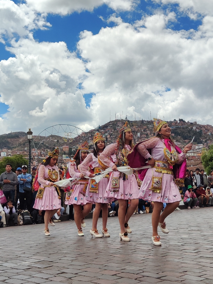 Five women in traditional pink outfits dance on a brick-paved area, holding a white cloth. Their outfits include matching crowns and shoes. Behind them, a crowd watches, and a hillside covered in buildings is visible in the background. A Ferris wheel and a statue atop the hill add to the scene. The sky above is filled with fluffy white clouds.