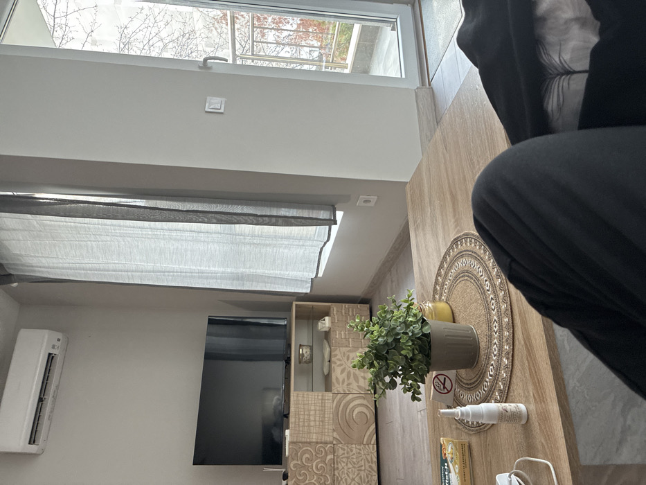 The scene depicts an interior living space, likely an apartment or hotel room, situated in Sofia, Bulgaria. The perspective is from a seated individual, with their lower legs and feet, clad in black sweatpants, visible in the lower right foreground. A light-colored wooden coffee table occupies the midground. Placed centrally on the table is a round, patterned placemat. On the placemat, a potted artificial plant with green foliage rests in a grey pot, accompanied by a small yellow container and a white circular sticker with a red "No Smoking" symbol. To the left of the plant, a white spray bottle and a rectangular package labeled with Bulgarian text "ТЕТ-Н" and "Аромат на дванадесет" are visible. A white cable extends from the left side of the table. The background features light grey walls and a light-colored floor. To the left, a black flat-screen television is positioned on a light-colored entertainment unit with patterned doors and open shelving containing a small decorative bowl. A white wall-mounted air conditioning unit is installed above the television. To the right, a large window covered by sheer grey and darker grey curtains allows natural light into the room. Adjacent to the window, a white-framed glass door, slightly ajar, opens to an outdoor balcony or patio. Beyond the door, bare tree branches and a silver metal railing are visible. Tiled flooring is present on the outdoor area. A white light switch is mounted on the wall section between the window and the door. The overall environment is well-lit, suggesting daytime conditions.