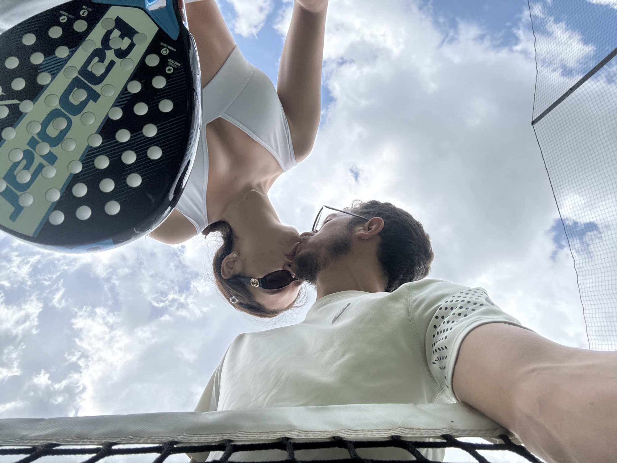 A couple kisses upside-down at a padel tennis court in Larnaca, Cyprus. The man has dark hair, a beard, and glasses. He wears a light-colored shirt with perforated sleeves. The woman wears a white athletic top and sunglasses. She is holding a Babolat padel racket. The backdrop features a partly cloudy sky and the netting of a padel tennis court.
