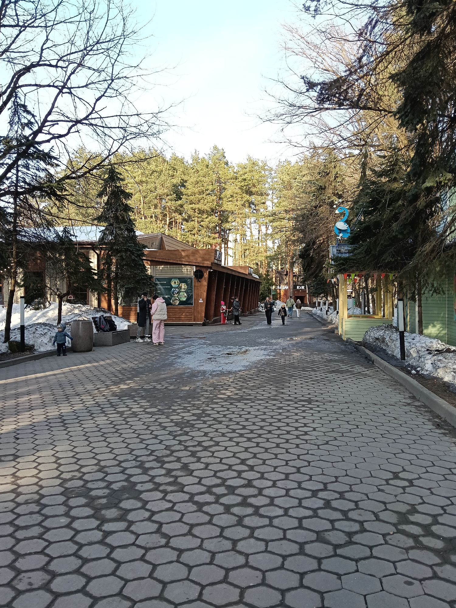 The image portrays an outdoor recreational area located in Domodedovo, Russia, under clear daylight. A wide pathway paved with dark hexagonal interlocking pavers extends from the foreground, with remnants of melting snow and dirt along its edges and a grey concrete curb line. On the left side of the pathway, a brown, two-story wooden building with a gabled roof and large windows is visible. A sign on its exterior displays text, likely in Cyrillic, and hexagonal graphic elements. A small evergreen tree stands in front of the building. Near this building, a child wearing a light blue jacket and pants stands on the pathway facing towards the right. Behind the child, two adults are present; one in dark clothing and another in a light pink tracksuit stand near the building's entrance. A dark bag rests on a low concrete planter or bench positioned beside the path. On the right side of the pathway, several smaller, light green wooden structures, possibly kiosks or small shops, are visible. Colorful bunting flags are strung between them. A prominent blue swan-shaped decorative figure is mounted on the roof of one of these structures. Tall evergreen trees and bare deciduous trees line both sides of the pathway, forming a dense background forest. Multiple individuals are present on the path. In the mid-ground, a group of approximately three to four people walks away from the viewer. Other individuals are visible in the distance near the green structures. The overall scene suggests a public park or leisure zone during late winter or early spring.