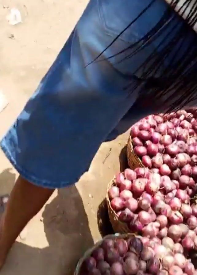 bustling outdoor market. The camera, held by someone walking, pans across displays of red onions in woven baskets and tomatoes arranged on small wooden tables. People, including women and children in various traditional attires, are seen walking and seemingly shopping. There are also sacks of goods stacked nearby. The ground appears to be uneven and strewn with trash. Overhead, canopies and umbrellas provide shade from the sun.