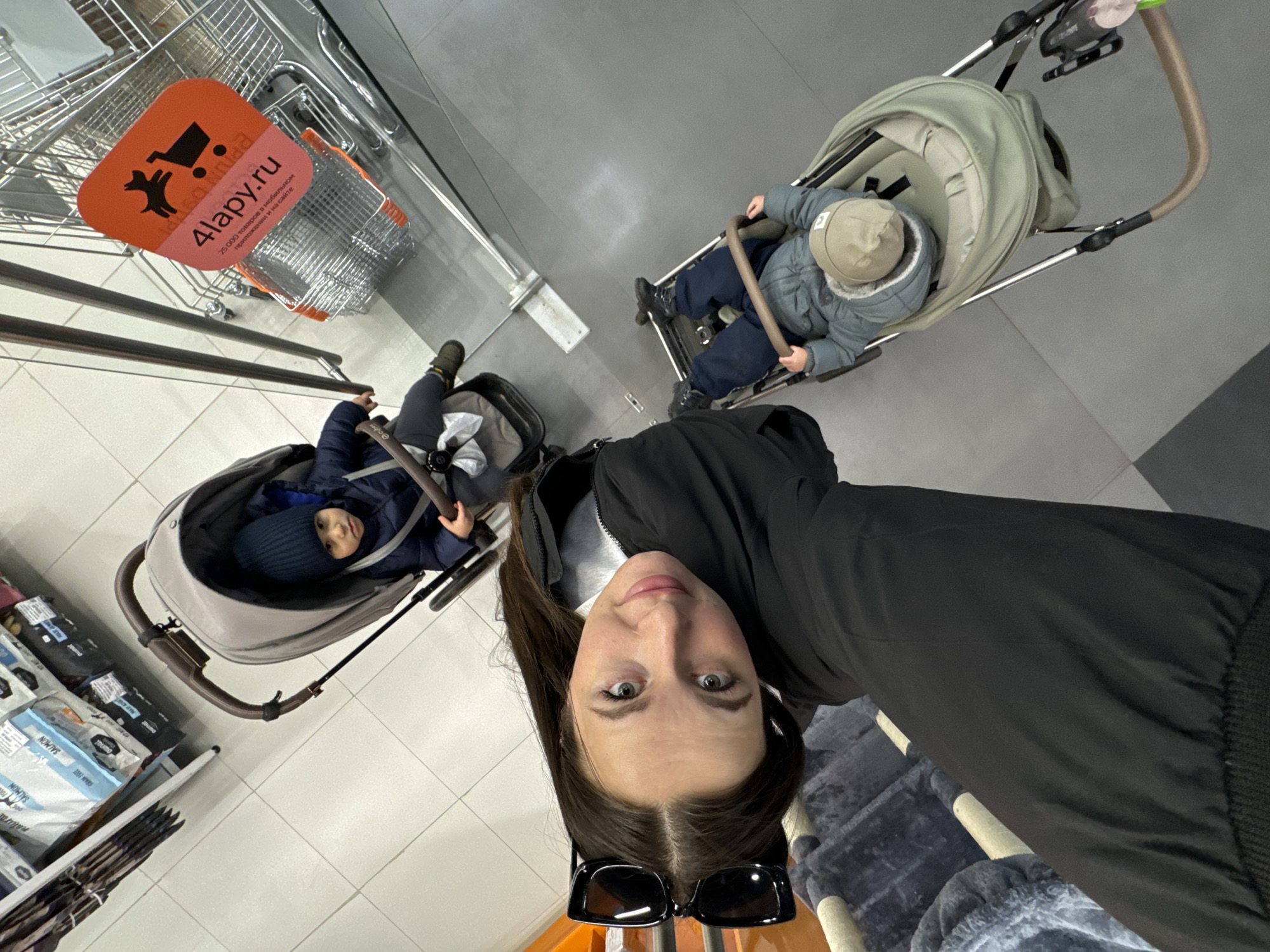 The image depicts an interior scene within a 4lapy.ru pet store in Unknown, Russia. A high-angle selfie captures an adult female and two infants in strollers. The female, positioned in the foreground, has dark hair, green eyes, and wears a black jacket over a grey garment, with black sunglasses resting on her head; she is looking directly at the camera. To her left and slightly behind, an infant in a grey stroller wears a navy blue hat and jacket, observing the camera. Further into the scene, to the lower right, a second infant is visible from the back in a light green stroller, wearing a light blue jacket with a fur-trimmed hood and a beige knit hat. The background reveals retail shelving stocked with pet food bags, some labeled "SALMON" in English and displaying Russian text. Near the center-right, an orange sign with the "4lapy.ru" logo (a dog pushing a shopping cart) is prominent, next to a stack of metal shopping baskets and carts. The floor transitions from white square tiles in the foreground to a solid grey surface further back. A blue textured blanket or item is partially visible on the left side, near the adult's arm.