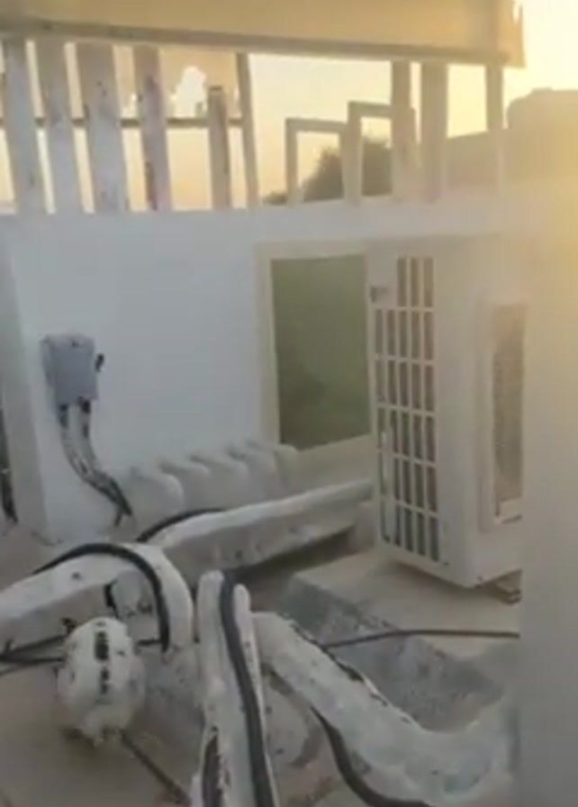 rooftop with various utility fixtures, including air conditioning units, electrical boxes, and insulated pipes. A rabbit with white fur and brown spots is seen on the roof. The background shows a sunset or sunrise, suggesting the time of day. The overall setting appears to be urban or suburban, with other buildings visible in the distance.