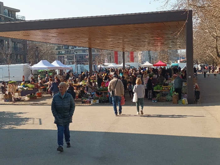 - "The image depicts an active open-air market in Blagoevgrad, Bulgaria, operating under a large, modern, dark-colored flat-roofed canopy structure supported by square pillars" by FM-MiSLx2, licensed under CC BY 4.0