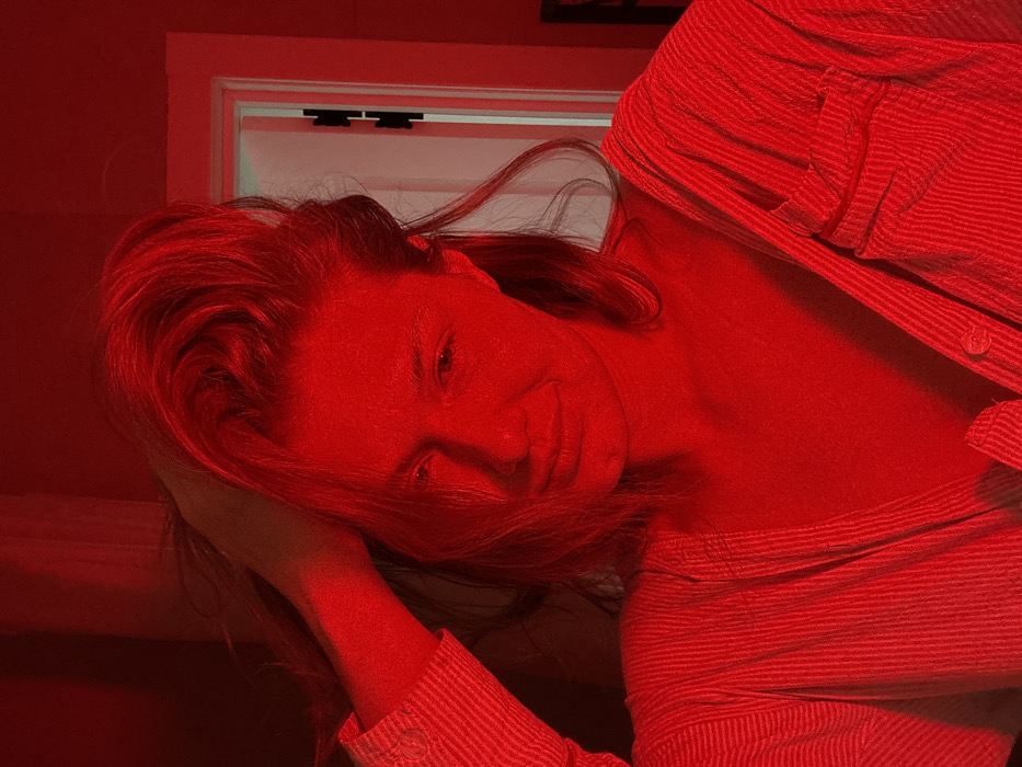 A medium-close-up image depicts a single female individual in an indoor setting, identified by the prompt as the city of Tashevka, Russia. The entire scene is bathed in a strong, monochromatic red artificial light, obscuring the true colors of objects and skin tones. The subject is positioned centrally, facing directly towards the viewer with a slight, closed-lip smile. Her eyes are open, and she appears to be looking into the camera. Her hair, which appears to be light in color beneath the red light, is styled with volume on top, and her right hand is visible with fingers running through the top-right portion of her hair, slightly lifting it. She is wearing a collared garment, possibly a shirt or blouse, with vertical stripes or a ribbed texture. The garment appears to be partially unbuttoned at the neckline. In the background, behind and to the right of the subject, a white door with dark hinges is visible, appearing slightly ajar. The wall surrounding the door and the rest of the visible background is uniformly rendered in deep red by the ambient lighting. No other distinct objects or furniture are discernible.