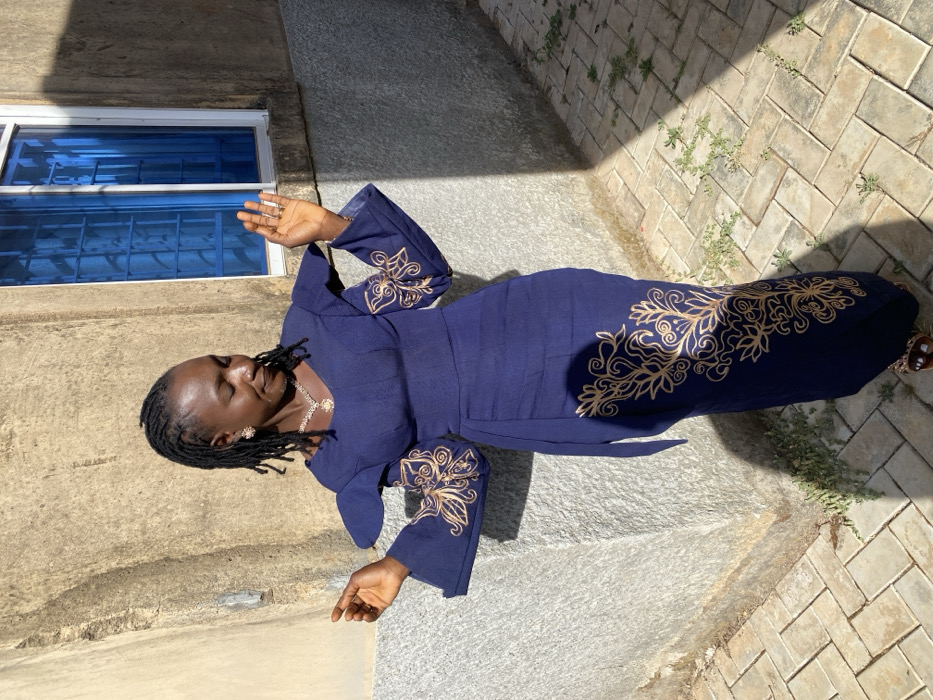 An outdoor image depicts a woman standing against a building wall, identified as being in Jos, Nigeria, though the specific location within the city is not visually discernible. The subject, a woman with dark skin and black dreadlocks, wears a navy blue, ankle-length dress with gold embroidered patterns on the bell sleeves and the lower right side of the skirt. She is accessorized with a gold-colored necklace and matching earrings, and wears open-toed brown sandals. Her arms are slightly raised and bent at the elbows, with open hands, as she looks downwards and to her right. The background consists of a textured, light beige concrete wall, with a segment of a grey block wall visible at the lower left. A white-framed window with blue-tinted glass is visible on the right side of the wall. The ground is paved with light-colored rectangular interlocking stones, featuring sparse green vegetation in the crevices. The scene is illuminated by direct natural sunlight, casting distinct shadow patterns on the ground and parts of the wall.