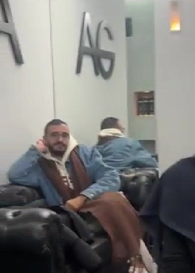young woman getting her hair dyed in a salon. She sits in a styling chair with a black cape covering her shoulders, her hair is piled on top of her head covered in hair dye. She's wearing jeans and a black top. She takes a selfie with her phone, smiling. In the background, a man wearing glasses, a denim jacket, a white hoodie, and a brown scarf is sitting on a black leather couch, looking at the woman. He appears to be waiting for her. The salon has light gray walls, a large mirror, and the logo "AG" on the wall.