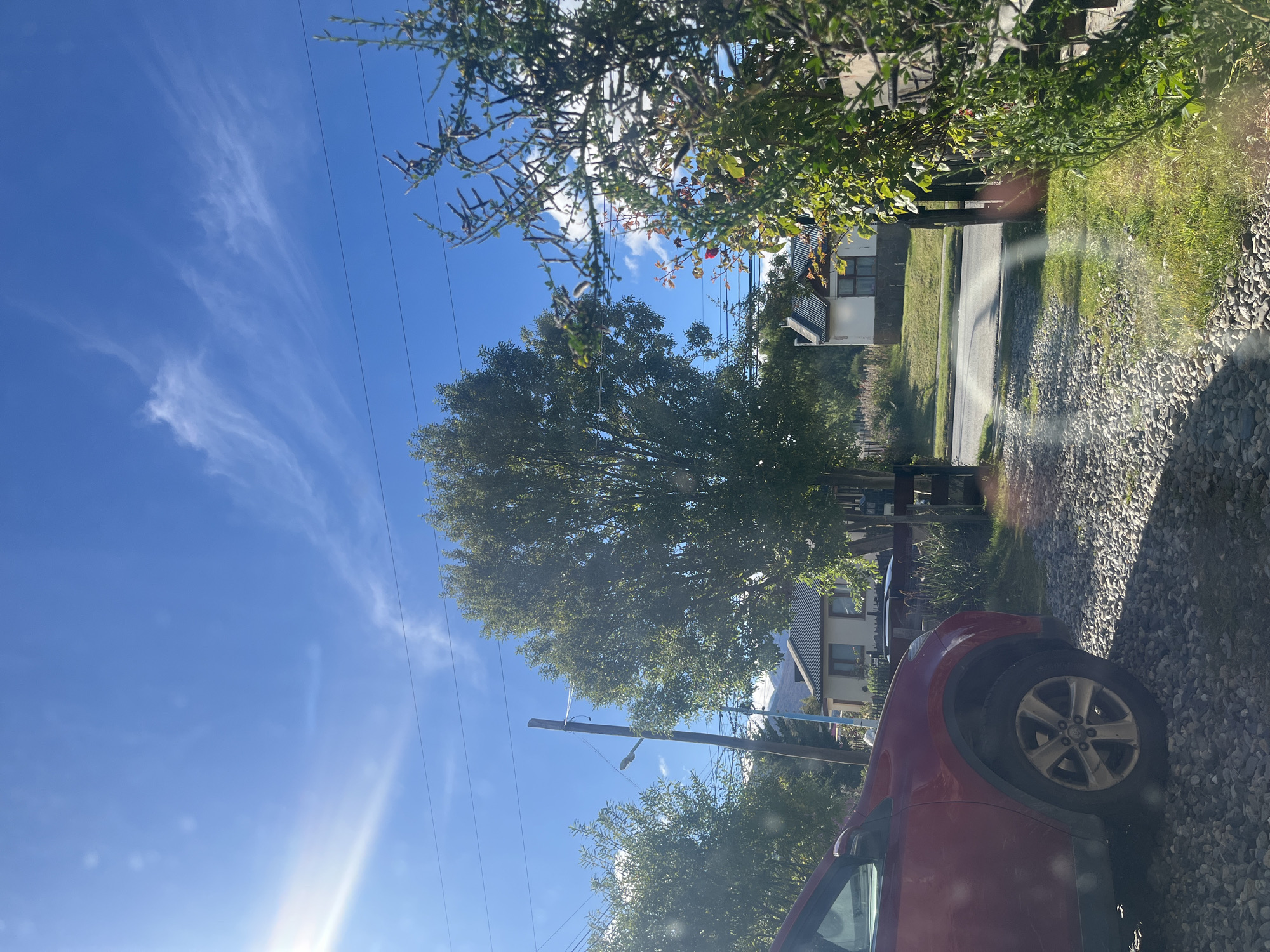 partially obscured street scene in Ushuaia, Argentina. A red car occupies the lower right corner, parked on a gravel surface. Beyond the car, a paved road runs alongside a grassy area, bordered by houses. Overhead power lines stretch across a partly cloudy blue sky. A large tree stands in the middle ground. The scene is partially obstructed by foliage in the foreground.