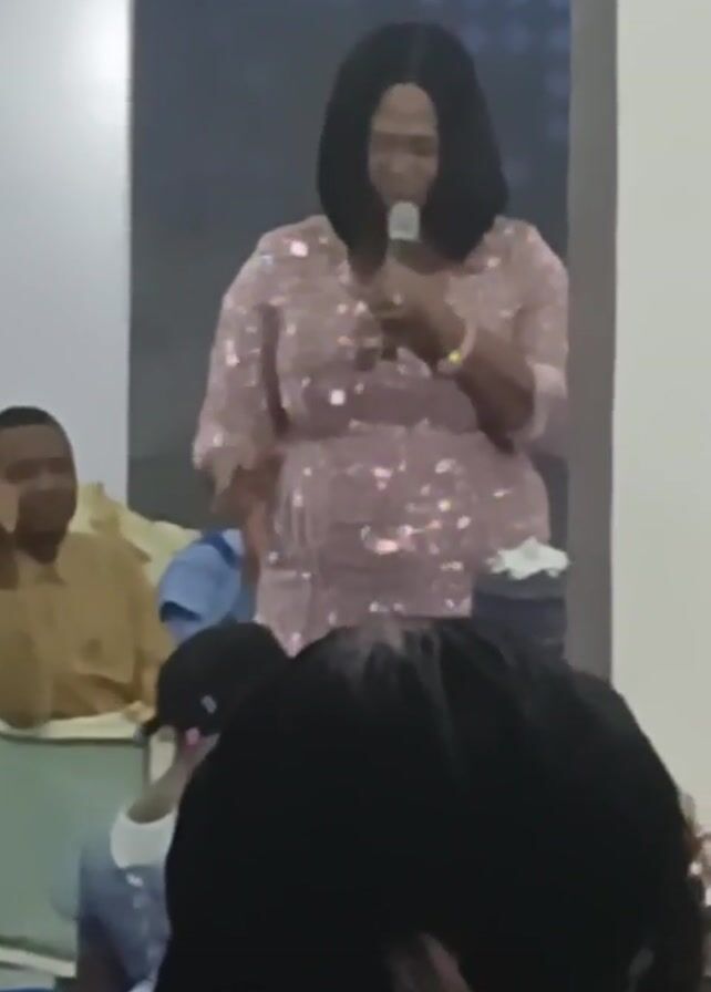 A woman is standing and speaking into a microphone, gesturing with her right hand. She has shoulder-length black hair and is wearing a pink sequined dress. A dark-skinned man in a tan shirt is partially visible seated on the left, and a girl in a blue dress is visible sitting to the right. Another person with dark hair is in the foreground, blocking the lower part of the view. The background consists of a gray wall with a lighter rectangle behind the speaker.