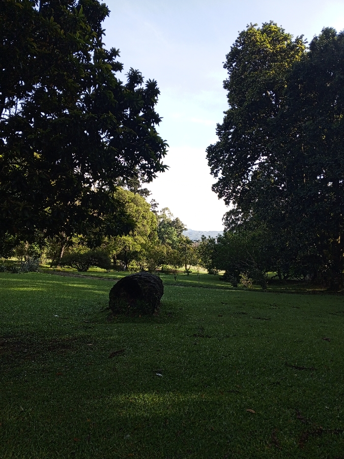 Lush green lawn stretches across the foreground, marked by a large, dark boulder. Towering trees frame the scene, their dense foliage creating a shaded canopy. A narrow opening between the trees reveals a brighter, sunlit area with smaller trees and hints of distant hills against a light blue sky. The overall impression is one of a tranquil, well-maintained park or garden.