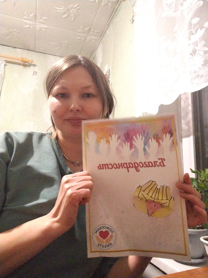 A light-skinned adult female with light brown hair and a neutral expression is captured in a front-facing photograph, centered in the frame. She wears a teal long-sleeved top and a necklace. She holds a white rectangular document or sign with both hands. The document features a colorful watercolor-style banner at the top, overlaid with white silhouettes of multiple raised hands. Below this, the word "Благодарность" (Gratitude/Thanks) is written in red Cyrillic text, appearing reversed. In the bottom right corner of the document, an illustration shows two cupped hands holding a pink heart. In the bottom left, a circular logo displays a red heart surrounded by two hands, with the reversed Cyrillic text "ПОМОГАЕМ ВМЕСТЕ" (We help together). The background consists of a light-colored wall with a textured pattern on the left, a white patterned ceiling above, and a window with a white lace curtain on the right. A potted plant is visible on a surface beneath the window on the right. The scene is illuminated by indoor lighting. This image was captured in Дойная, Russia.