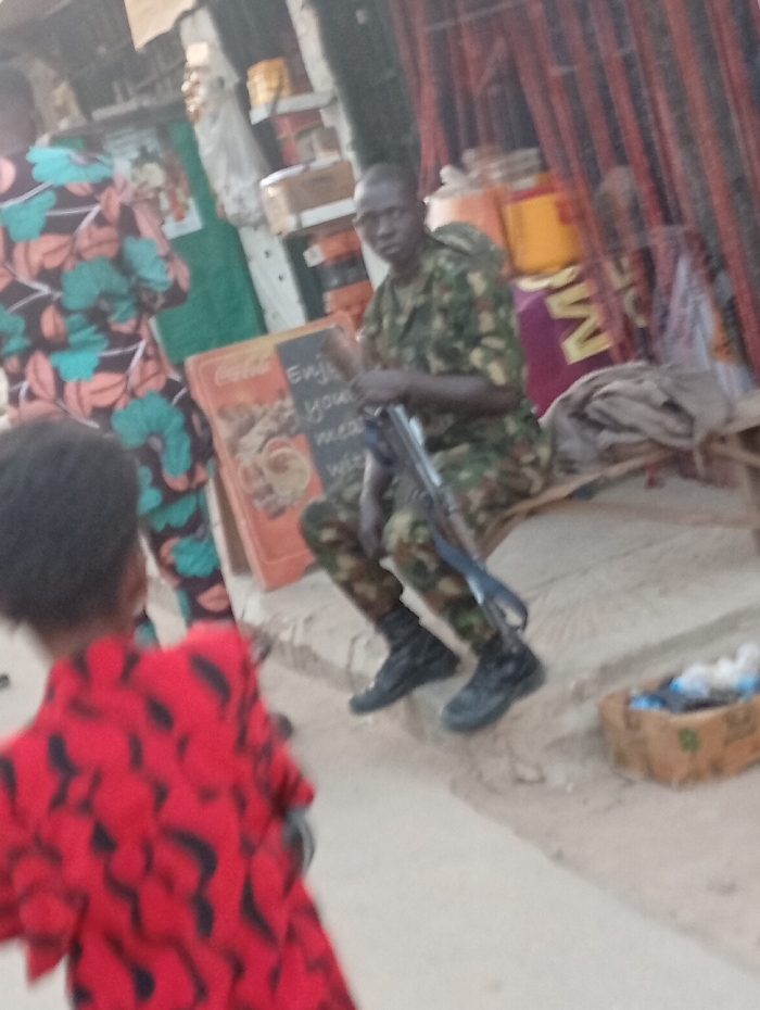A man in military camouflage sits on a bench, holding a rifle, near a Coca-Cola sign. He wears black boots and has a backpack behind him. The scene appears to be outdoors near a shop. A person in a red and black patterned shirt stands in the foreground, and another person in a floral pattern is partially visible in the background. A cardboard box sits on the ground near the bench.