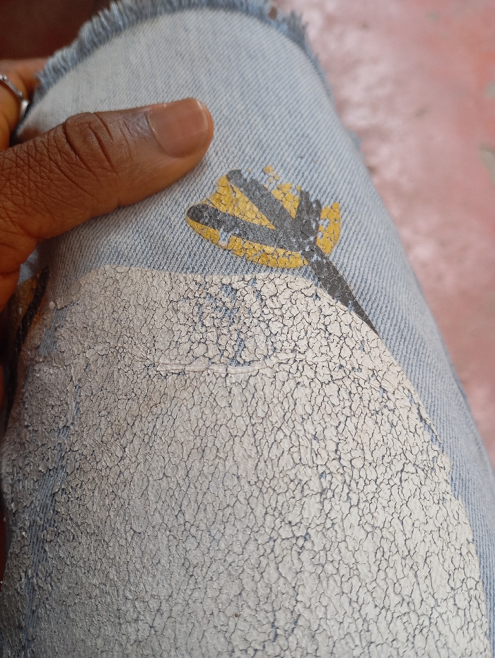 A close-up, high-angle view depicts a person's upper leg, clad in a light blue denim garment, situated in Onitsha, Nigeria. A dark-skinned hand, featuring a silver ring on one finger, is positioned on the denim in the upper left portion of the frame. The denim displays a large, irregularly shaped section of extensively cracked, off-white material covering the lower half. Above this textured patch, a stylized design resembling a segmented flower or abstract motif is visible, rendered in dark grey/black and yellow. The upper left edge of the denim shows fraying. The background is out of focus and appears as a reddish-brown color.
