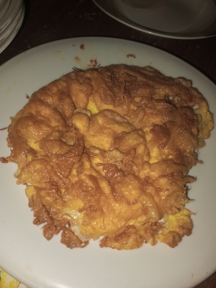 - "An overhead shot reveals a single, deep-fried egg dish, golden to dark brown and irregularly shaped, presented on a white, round plate" by FM-QXFPH2, licensed under CC BY 4.0