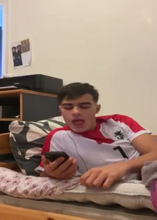 A young man lies on a bed, looking at his phone. He has dark hair and wears a white and red sports jersey. He has earphones in. The bed has a wooden frame and a patterned sheet and pillow. Behind the bed is a light-colored wall with a shelf that holds a printer and other items. A window with a blue curtain is visible. The man gestures with his finger as he looks at the phone.