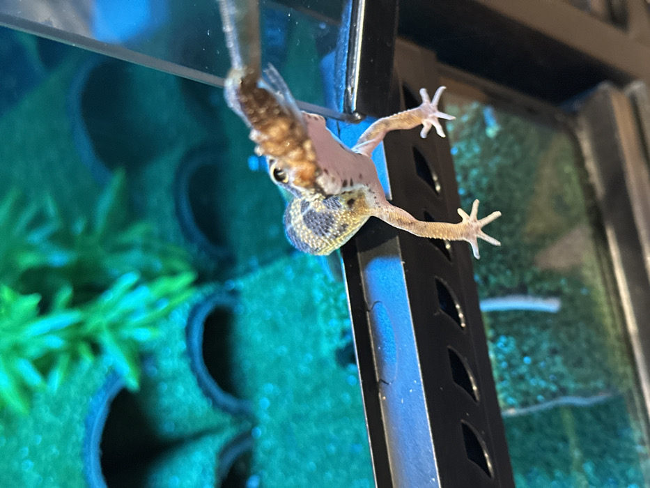 A leopard gecko is depicted feeding within a terrarium environment