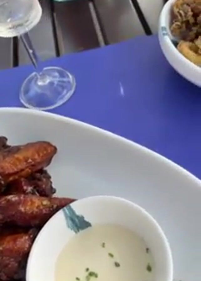 table on a patio at what appears to be a resort. On the table are two plates of food, one containing chicken wings with dipping sauce and the other containing fried calamari. There are also a water bottle, a wine glass, an ashtray, and a cell phone on the table. A woman is seated at the table, holding silverware. The patio overlooks a swimming pool and manicured lawn.