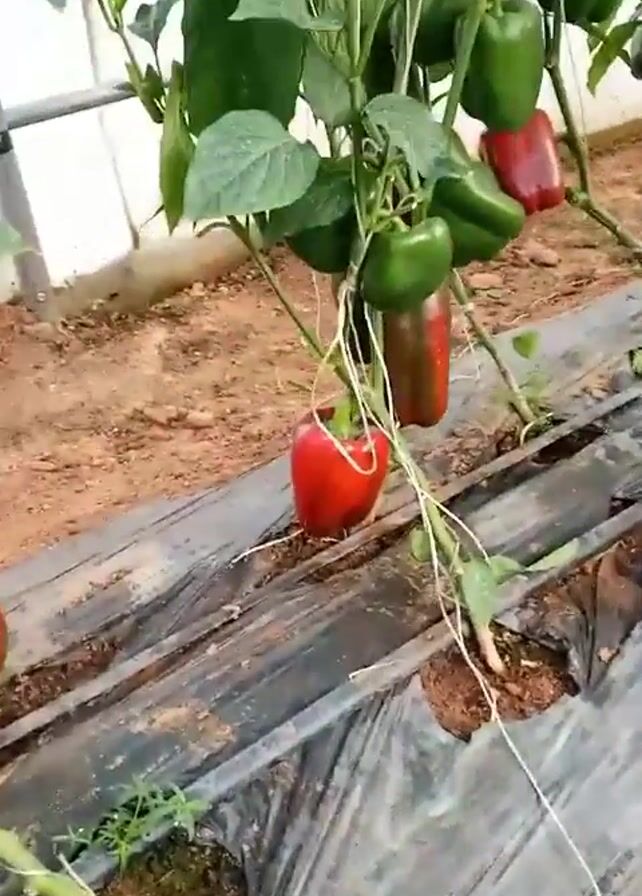 row of bell pepper plants in a greenhouse. The plants are growing in soil covered with black plastic sheeting. The peppers are a mix of green and red. The plants are supported by white strings. The greenhouse appears to be well-lit.