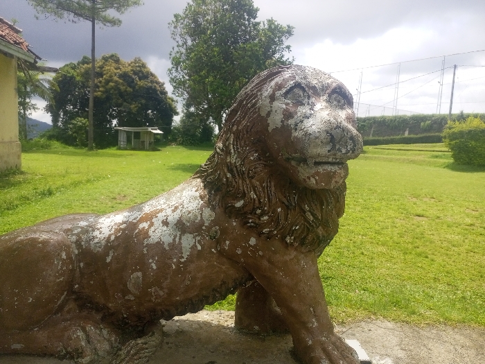 A weathered, crouching lion statue, exhibiting significant peeling light-colored surface material over a darker brown base, dominates the foreground and midground