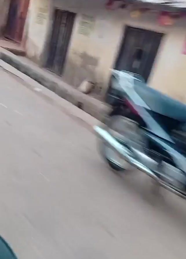 A person wearing jean shorts, a striped shirt, and sneakers walks along a street with low buildings on either side. A motorcycle is parked near the beginning of the clip. The camera appears to be moving forward, following the person walking. The scene is captured from a low angle, slightly angled downwards towards the street.
