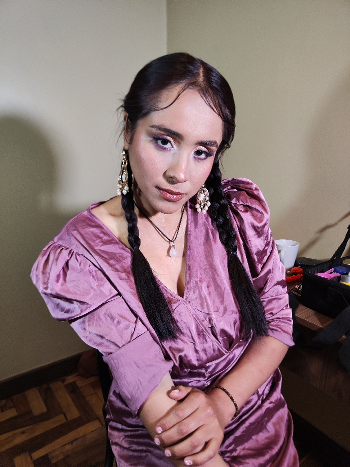 A woman with braided dark hair, adorned with ornate earrings, poses in a lilac-colored, puffy-sleeved dress. Her makeup is dramatic, featuring purple eyeshadow. A delicate necklace rests on her chest. The setting appears to be indoors, with a plain wall behind her. A desk with makeup supplies and a white mug is visible on her right. She looks directly at the camera.