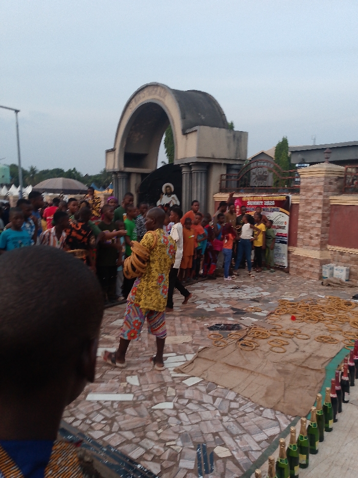 An outdoor scene depicts a gathering of people, including many children, near an ornate archway with a statue of Jesus inside. A man in a patterned yellow shirt and shorts stands near a collection of ring-shaped objects on a brown sheet. Rows of bottles line the edge of the area. A banner reads "SUMMIT 2025". The ground is covered in a mosaic of tiles. The overall impression is of a public event or performance taking place in front of what appears to be a church or religious site.