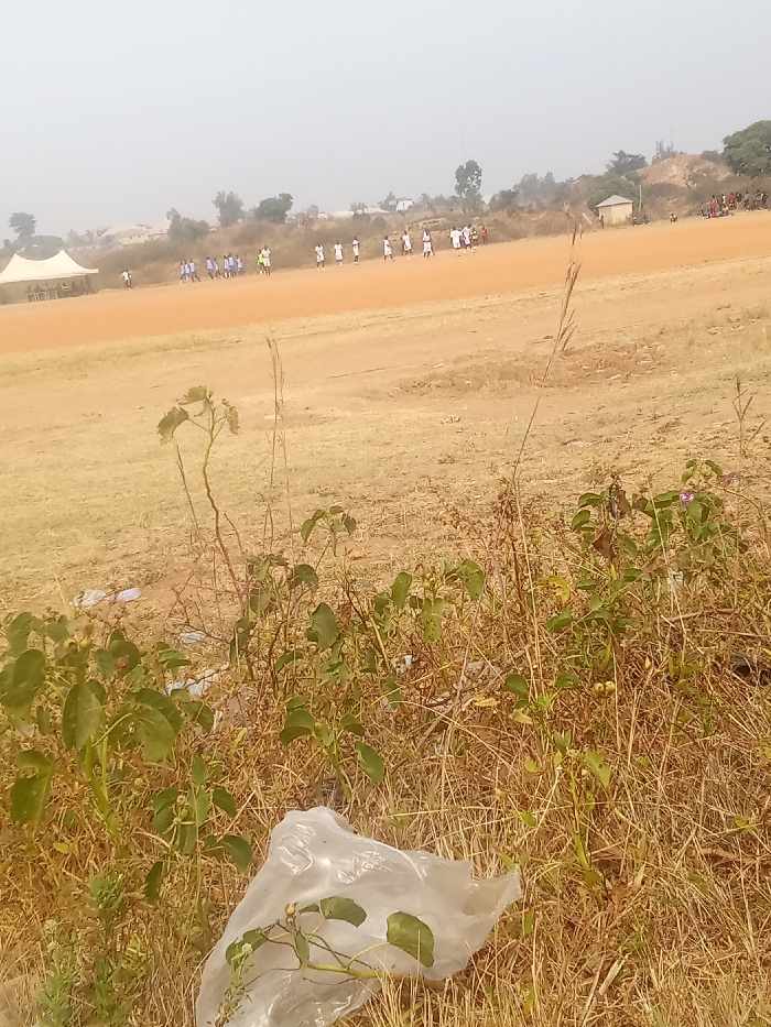 A low-angle shot shows a dry, grassy field with scattered plants and litter, including a plastic bag, in the foreground. In the distance, a sports team is visible on a dirt pitch, possibly lining up for a game or practice. A white tent and small buildings are also visible in the background, under a hazy sky. The overall scene conveys a sense of neglect.