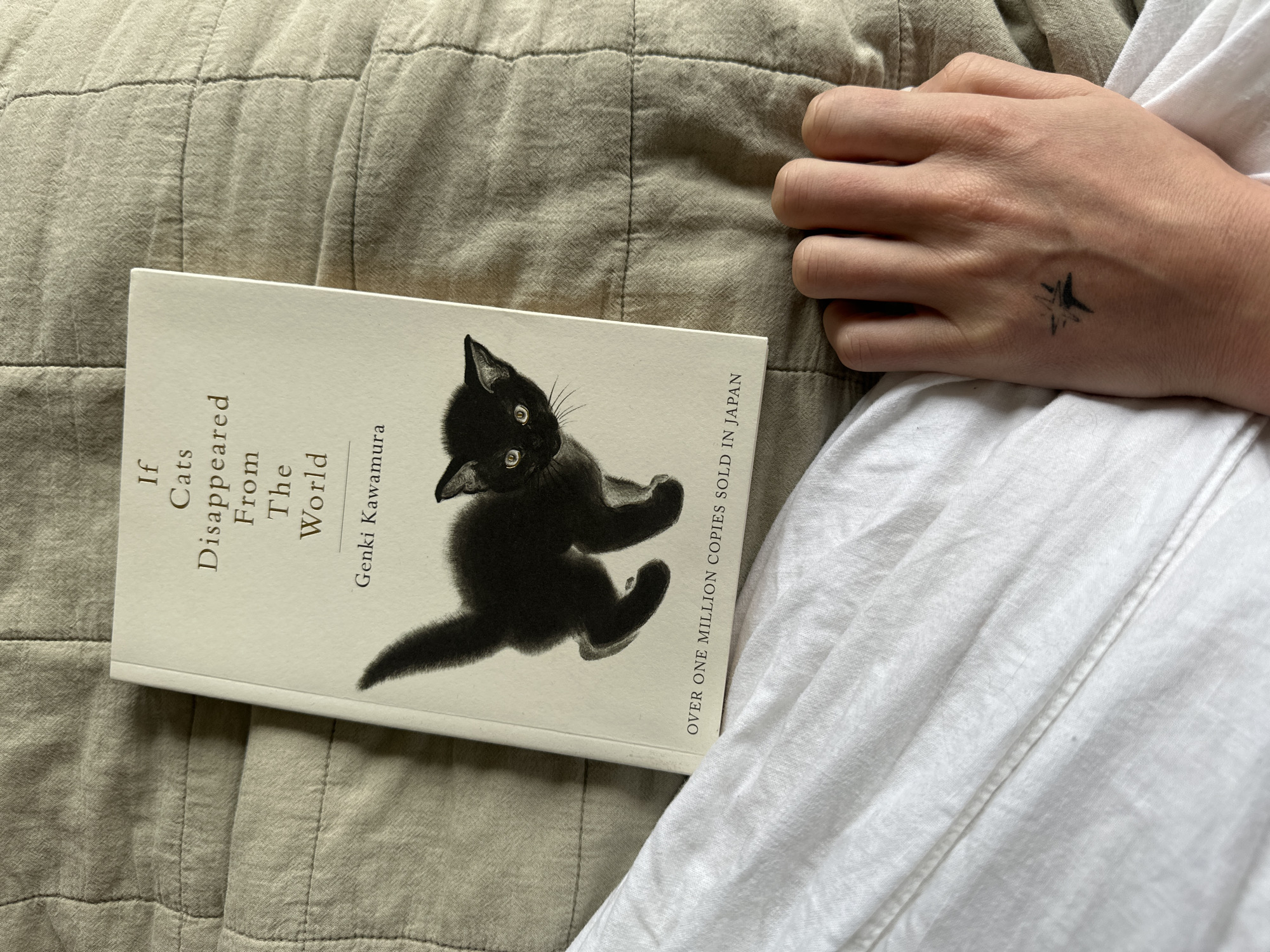 The scene is located indoors within Wealden, United Kingdom, and is depicted from an overhead perspective. A human left hand and a book rest upon a light beige quilted fabric, which exhibits a consistent grid stitch pattern. Centrally positioned, a paperback book titled "If Cats Disappeared From The World" by Genki Kawamura lies face up. The book's cover features a black kitten with yellow eyes, and below the illustration, the text "OVER ONE MILLION COPIES SOLD IN JAPAN" is visible. To the right of the book, a fair-skinned human left hand rests palm-down on the quilted fabric, with fingers slightly curled. A small, dark, stylized star-shaped tattoo is present on the dorsal surface of this hand, near the base of the index finger. A wrinkled white fabric, consistent with either clothing or bedding, occupies the lower left portion of the frame, extending underneath the book and the person's arm area.