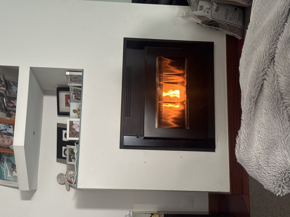 An interior scene in Nogueira e Silva Escura, Portugal, depicts a residential living space. A dark-framed, built-in fireplace insert is active, showing prominent orange and yellow flames behind its glass panel. Above the fireplace, two white floating L-shaped shelves are mounted on a white wall. The lower shelf displays multiple framed photographs, primarily depicting infants and children, and a silver-colored gingerbread-man-shaped figurine on the left. The upper shelf also contains various framed photographs, including one with a visible boat image. A dark brown wooden baseboard runs along the bottom of the white wall. On the floor in the foreground, a light grey, textured, fluffy blanket is partially visible. To the right of the fireplace, a translucent plastic bag containing dark wood pellets rests against the wall on a grey carpeted surface, adjacent to a visible dark wooden floor section. No individuals or direct interactions are depicted.