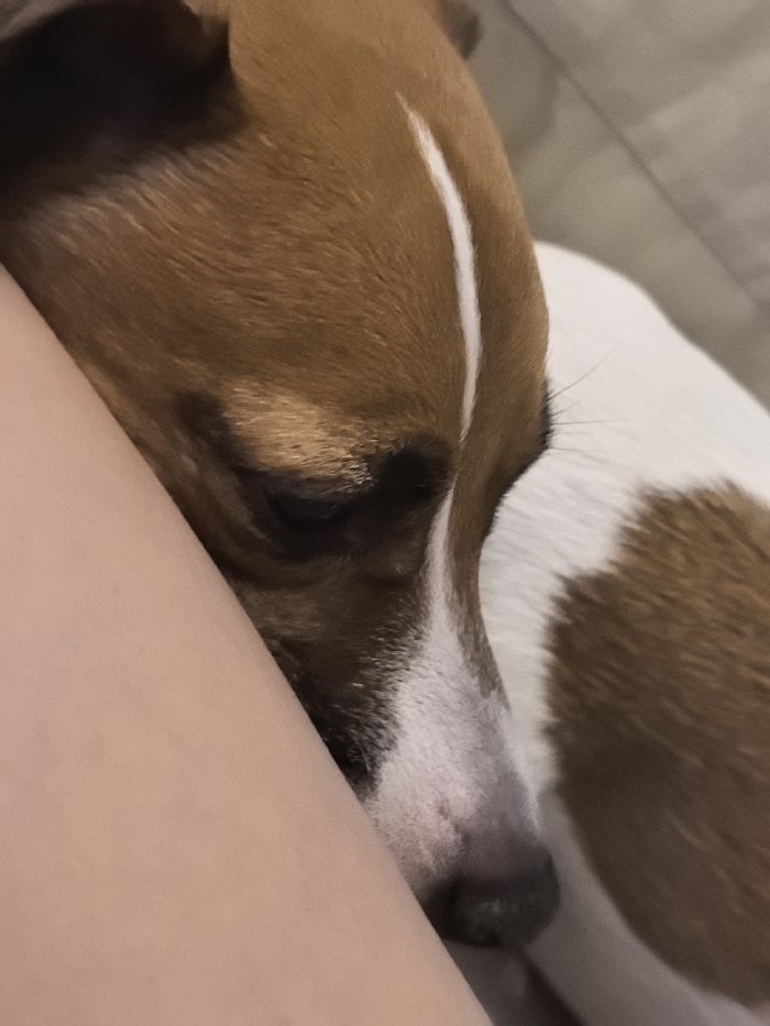 - "A brown and white Jack Russell Terrier rests its head against a person's arm" by FM-n9jqp1, licensed under CC BY 4.0