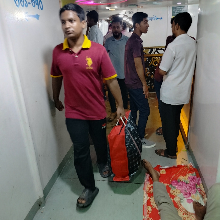 Inside a corridor, a man in a maroon polo shirt, black pants, and sandals carries a red and black bag. Others stand nearby, including one in a white shirt leaning against the wall. A mat with a floral pattern lies on the floor, and a person appears to be resting on it. Signage with numbers and an arrow is visible on the wall.