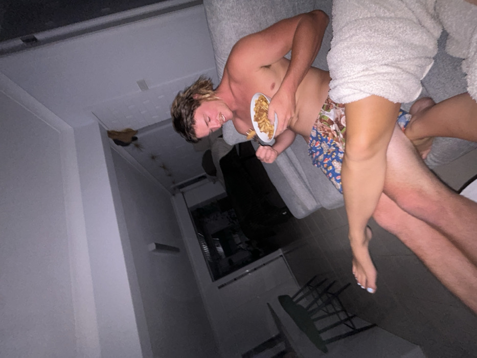 The scene is an interior domestic setting in Bulli, Australia, observed from a low perspective. A young adult male is seated on a light grey upholstered couch, shirtless, with light brown, shaggy hair. He holds a white bowl filled with pasta in his left hand and a fork in his right hand, positioned towards his mouth. He is smiling, looking downwards. His torso and upper arms display some redness. He wears patterned shorts featuring blue and brown designs. Resting across his lap are the legs of another individual, partially covered by a cream-colored, fluffy blanket or garment. The visible foot has light blue nail polish on the toes. In the background, to the left, a dark four-legged stool is visible. Further back, an open doorway reveals a darker adjacent room. On the wall behind the male, a brown object hangs, and below it, a string of small, star-shaped or similar light-colored decorations is affixed. A fluorescent tube light fixture is present on the ceiling. The overall lighting is dim.