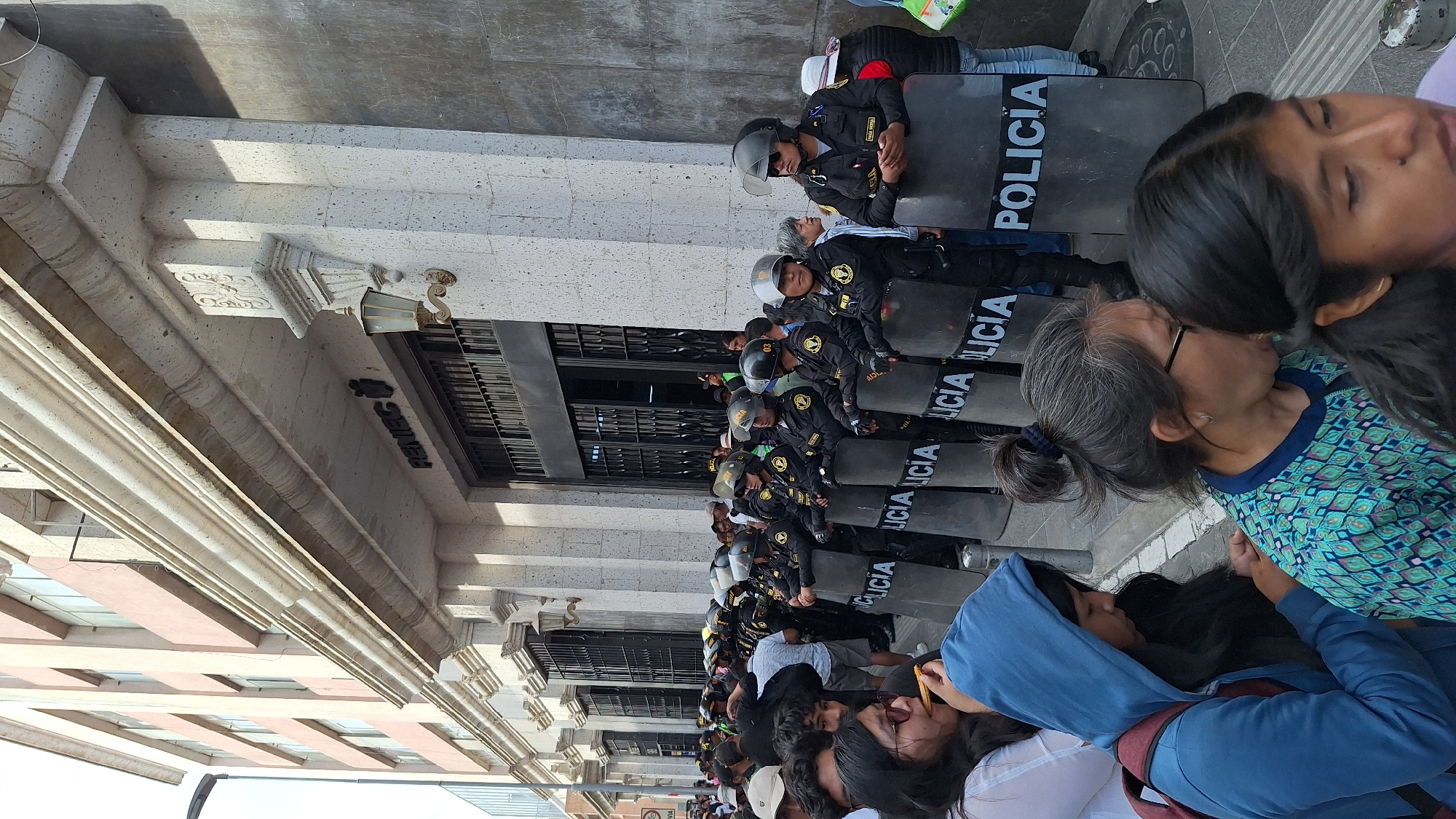 A street-level view in Arequipa, Peru, reveals a line of riot police, identified by "POLICIA" emblazoned on their shields, positioned against a building's exterior