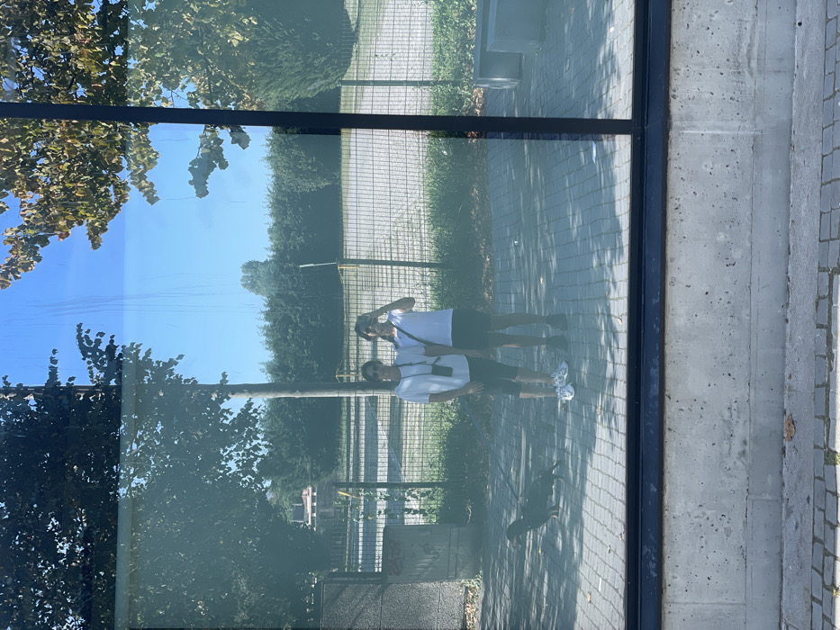 A reflection of an outdoor scene is captured in a large glass panel, framed at the bottom by a dark border and a light grey concrete wall. The reflected scene depicts two individuals and a dog on a paved surface under a clear blue sky, surrounded by urban greenery. **Location in Porto, Portugal:** This scene is situated in an urban green space within Porto, Portugal, likely an area adjacent to a modern public building featuring extensive glass facades. The environment suggests a developed park, a recreational area, or a campus setting, characterized by both paved pedestrian zones and natural elements. **Detailed Scene Description:** The reflection shows two individuals of apparent adult age standing on a light grey paved surface constructed from interlocking pavers. 1. The individual on the left wears a white short-sleeved top, dark capri-length pants, and white athletic shoes. Dark sunglasses are worn on her face, and a white rectangular object, possibly a camera or small bag, hangs around her neck via a strap. Her arms are positioned down at her sides. 2. The individual on the right wears a white short-sleeved top, dark shorts, and dark shoes. She holds a dark-colored smartphone directly in front of her face, obscuring it, as if taking a photograph or video. A dark strap or bag is visible diagonally across her chest. Between and slightly ahead of the individuals, a small, dark-coated dog, resembling a Dachshund due to its elongated body and short legs, is walking to the left on the paved surface. The background of the reflected scene features a chain-link fence separating the paved area from a lighter-colored, unpaved ground, which appears to be dirt or gravel. Beyond this, a dense line of various green trees and shrubs forms a natural barrier. A single, slender tree trunk is prominent in the middle-left background. In the far left background, a light-colored building with a reddish roof is partially visible above the tree line. The upper portion of the reflection reveals a bright, clear blue sky, partially overlaid with the dark green foliage of trees reflected from above or behind the camera's position. Distinct shadows are cast on the paved ground, indicating direct sunlight. The actual foreground, outside the reflection, consists of the dark frame of the window, a roughly textured light grey concrete base wall, and the same type of paved surface extending downwards.
