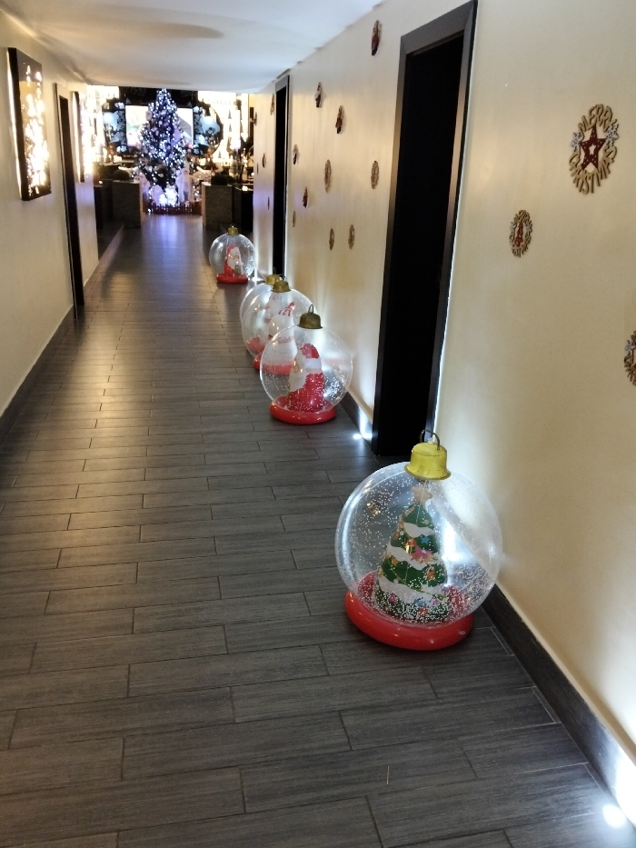 A hallway is decorated for Christmas with large snow globes lined along the floor