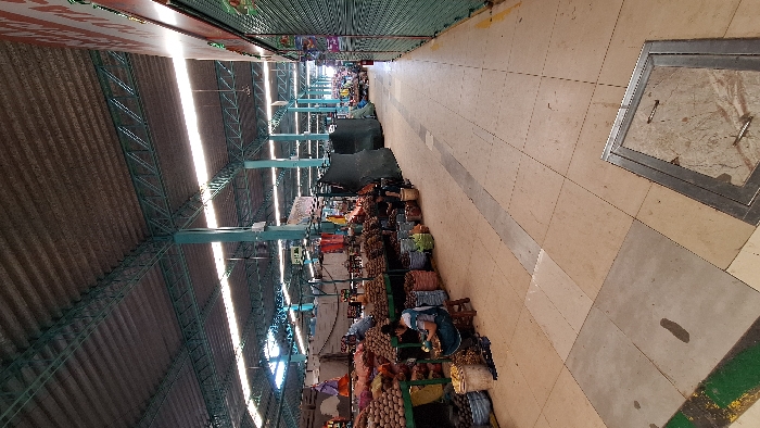 An indoor marketplace presents a perspective view down a long aisle. Stalls line one side filled with produce, with vendors attending to their goods. The roof features metal supports and panels, letting in streaks of light. The floor is tiled, with a metal-edged access panel on the right. People are visible in the distance at the end of the aisle, adding depth. The color scheme primarily includes earthy tones, accented by bright colors from the merchandise.