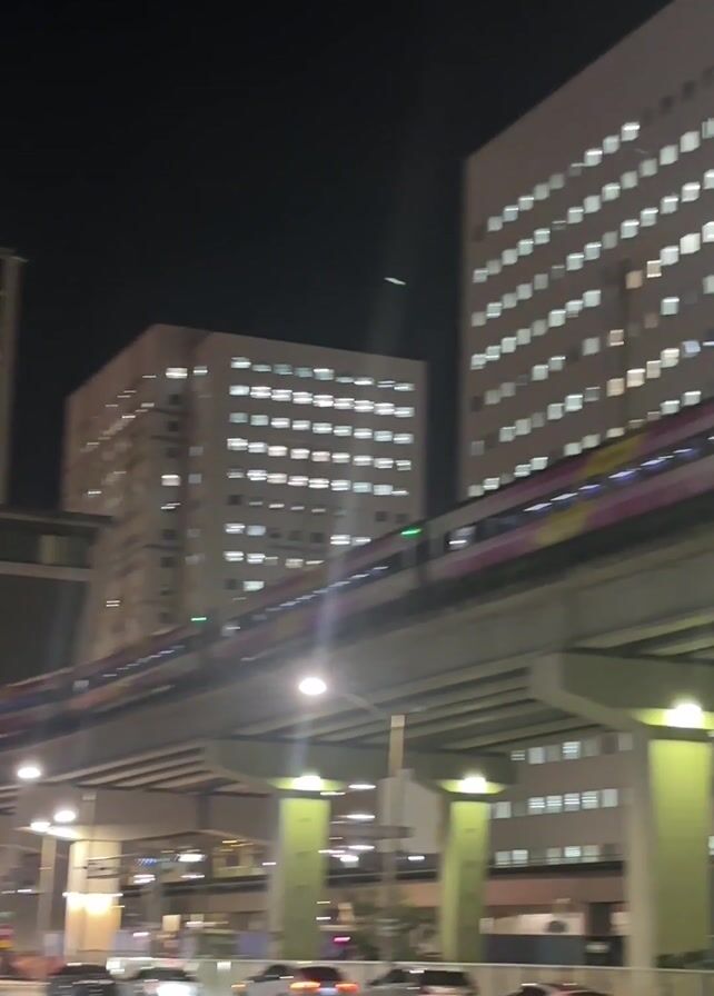 n elevated train moving on a track supported by pillars in an urban environment at night. The train is multi-colored, with stripes of pink, yellow, and white. The street below is lit by streetlights and is lined with parked cars. Tall buildings with illuminated windows stand in the background. The camera pans to follow the train, momentarily encountering a bright glare from a streetlight. The scene evokes a sense of urban transit at night.