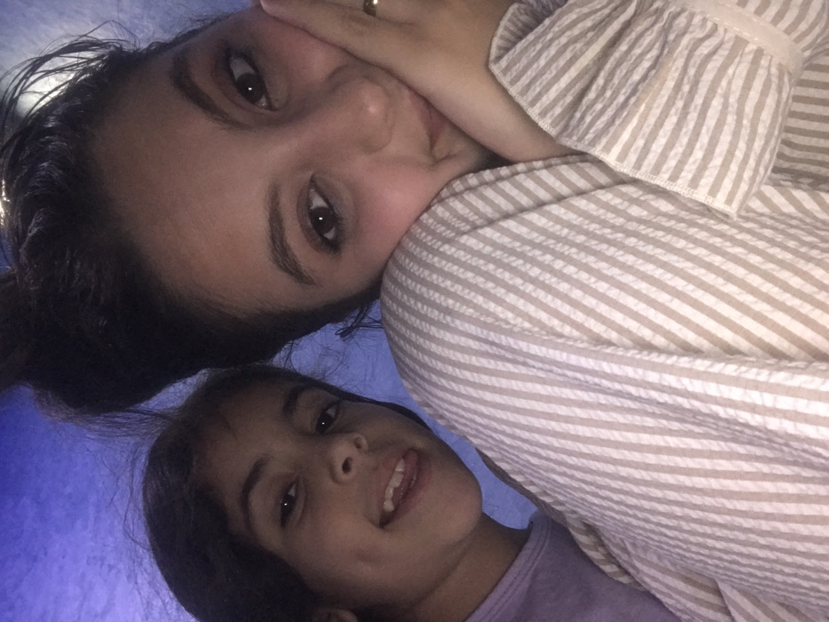 An image captured in Ouislane, Morocco, depicts two females in a close-up composition. On the left, a young girl with dark hair and dark eyes smiles, her tongue slightly extended, and she exhibits dimples. She is wearing a light purple top. To her right, an older female, with dark hair gathered in a bun, is partially obscured, subtly smiling with her right hand covering part of her cheek and mouth. A gold-colored ring is visible on her right ring finger. She is dressed in a light-colored, vertically striped shirt with a textured, possibly seersucker, fabric. The background is a uniform, indistinct blue-purple.