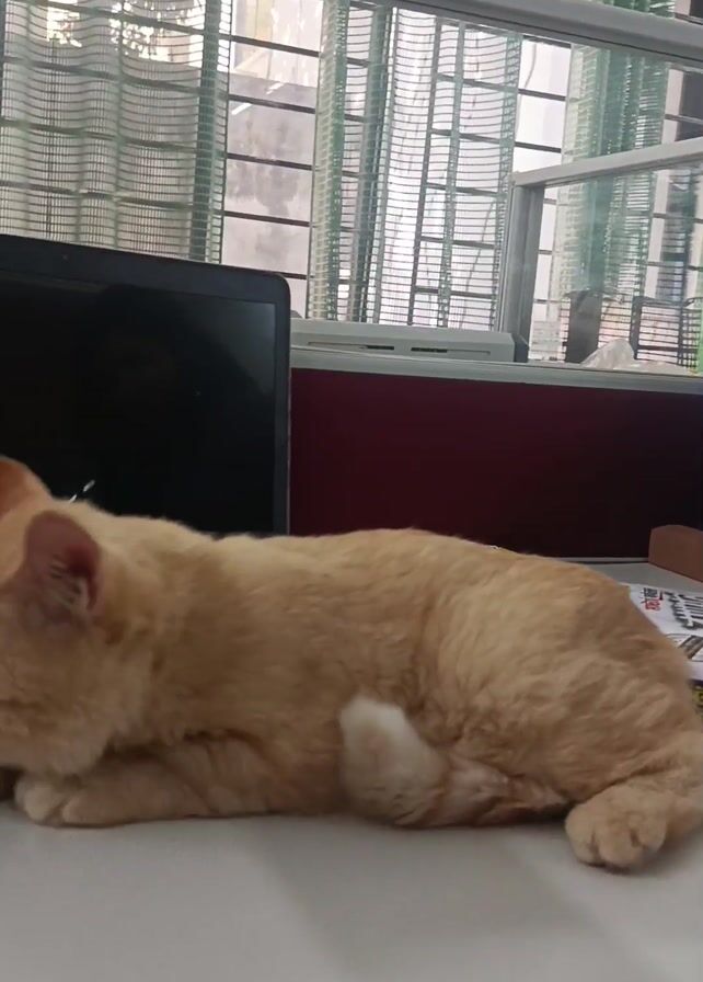 fluffy, orange cat lying on a white desk beside a black laptop computer. The cat is mostly stationary, occasionally moving its head or blinking. The desk has books and other office supplies on it. In the background, there are windows with blinds, and office cubicle partitions. The light is bright. A person speaks in the background.